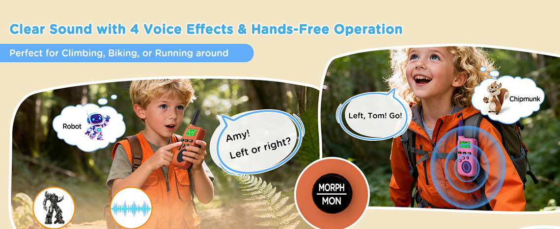 𝗛𝗮𝗻𝗱𝘀-𝗙𝗿𝗲𝗲 & 𝗣𝗼𝗿𝘁𝗮𝗯𝗹𝗲: With smart VOX voice activation, mini walkie talkies let kids talk hands-free - perfect for climbing, biking, or running around! The handy belt clip makes them easy to carry anywhere. Lightweight, portable, and always ready for action!