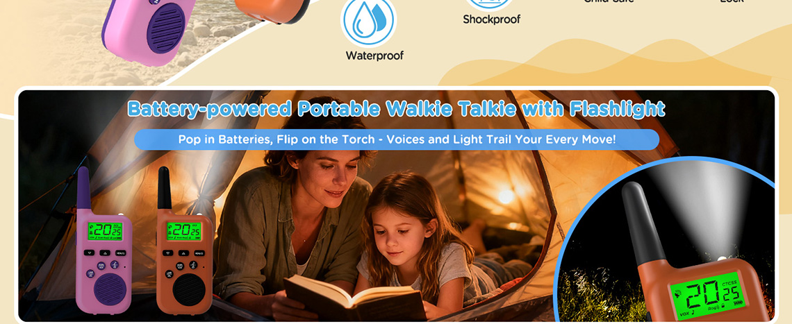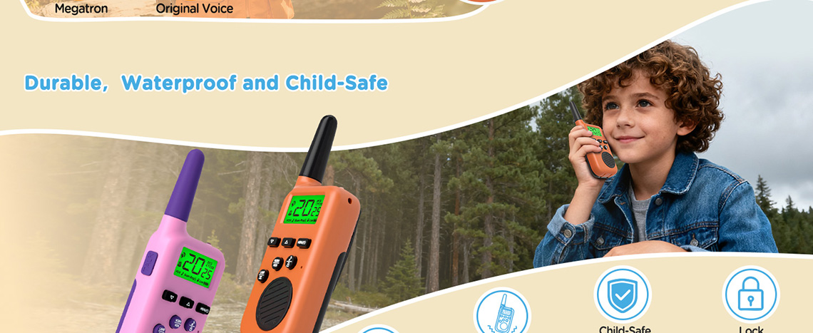 𝗗𝘂𝗿𝗮𝗯𝗹𝗲 & 𝗖𝗵𝗶𝗹𝗱-𝗦𝗮𝗳𝗲: Worried about drops, splashes, or accidental presses? Don’t be! Waterproof walkie talkies are built to survive real play. The keyboard lock keeps settings secure, and the rugged design stands up to rough handling. Let the kids play freely - rain or shine!