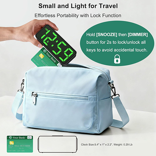 𝗧𝗿𝗮𝘃𝗲𝗹 𝗕𝗮𝘁𝘁𝗲𝗿𝘆 𝗣𝗼𝘄𝗲𝗿𝗲𝗱 𝗣𝗼𝗿𝘁𝗮𝗯𝗹𝗲 𝗔𝗹𝗮𝗿𝗺 𝗖𝗹𝗼𝗰𝗸 𝘄𝗶𝘁𝗵 𝗟𝗼𝗰𝗸 𝗙𝘂𝗻𝗰𝘁𝗶𝗼𝗻: Powered by 4 AAA batteries (not included), this clock offers complete cordless freedom for travel or bedside use. Its key lock function prevents accidental button presses, keeping your settings secure and ensuring reliable operation wherever you go.
