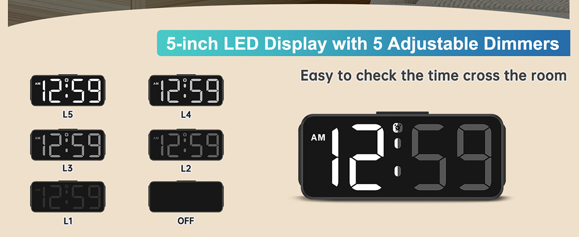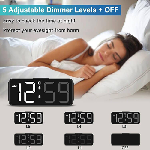 𝐃𝐢𝐦𝐦𝐚𝐛𝐥𝐞 𝐀𝐥𝐚𝐫𝐦 𝐂𝐥𝐨𝐜𝐤 𝐰𝐢𝐭𝐡 𝟔 𝐃𝐢𝐦𝐦𝐞𝐫𝐬: As a modern alarm clock for bedrooms , this brightness clock has 5 adjustable dimmer levels+OFF to satisfy different needs for brightness. The level of brightness does not distract you from sleeping, ensuring that you can clearly see the time cross the room and easily check the time at night with its large number. More importantly, this electronic clock can protect your eyesight from harm with adjustable dimmer.