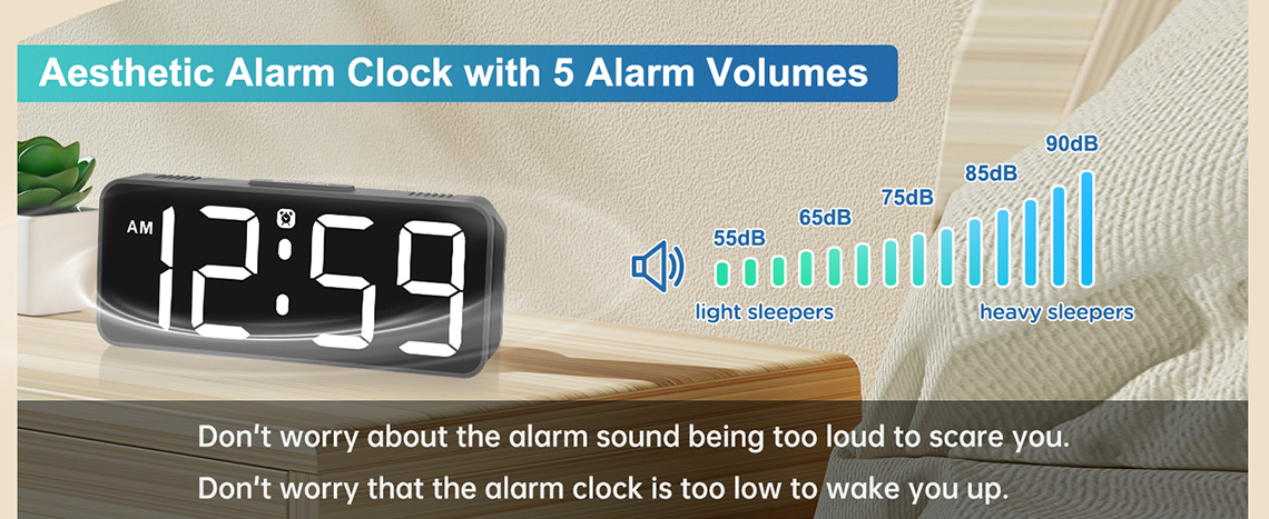 𝐋𝐨𝐮𝐝 𝐀𝐥𝐚𝐫𝐦 𝐜𝐥𝐨𝐜𝐤 𝐰𝐢𝐭𝐡 𝟓 𝐀𝐝𝐣𝐮𝐬𝐭𝐚𝐛𝐥𝐞 𝐕𝐨𝐥𝐮𝐦𝐞𝐬: Different people have different needs regarding alarm volume and snooze time. In order to wake you up naturally and gently, not suddenly, this dimmer clock has 5 alarm volumes to choose from, ranging from 55-90 dB. If you have trouble getting out of bed, the 9-minute snooze function provides the perfect wake-up cushion.
