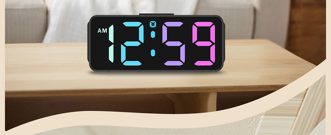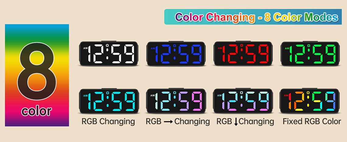 𝐑𝐆𝐁 𝐀𝐥𝐚𝐫𝐦 𝐂𝐥𝐨𝐜𝐤 𝐰𝐢𝐭𝐡 𝐂𝐨𝐥𝐨𝐫𝐟𝐮𝐥 & 𝐃𝐲𝐧𝐚𝐦𝐢𝐜 𝐋𝐚𝐫𝐠𝐞 𝐃𝐢𝐬𝐩𝐥𝐚𝐲: Enjoy 8 different color display screens (4 Pure colors - white, blue, green and red + 3 Dynamic RGB Color and 1Fixed RGB color). This bedroom alarm clock features large, easy-to-read numbers that change color, adding a vibrant touch to your room. Enjoy a lively wake-up experience and easily see the time from any distance. Fully meets different people's color needs.