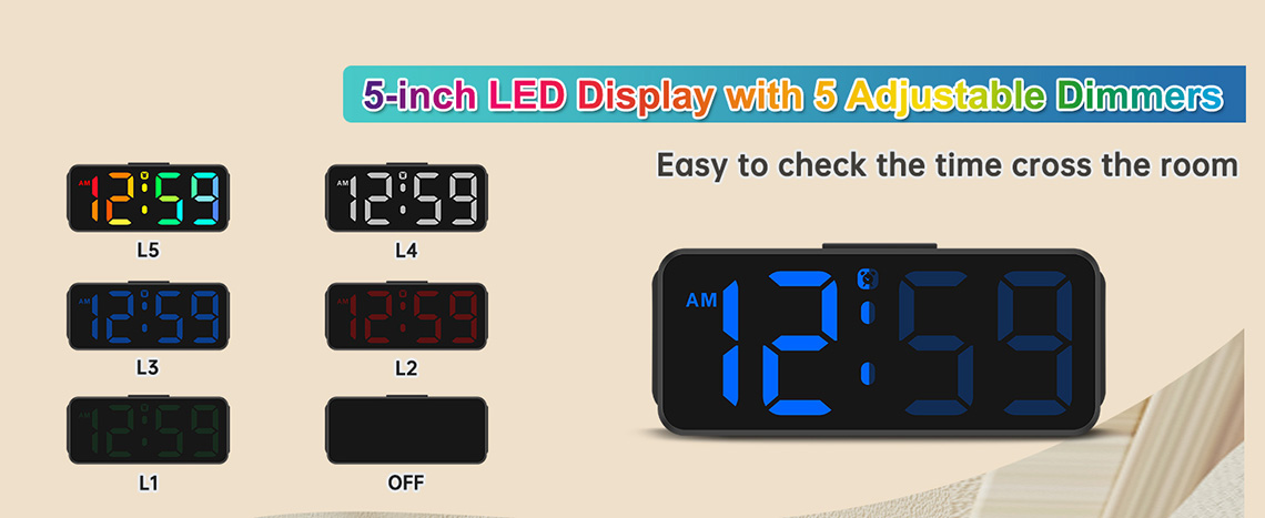 𝐃𝐢𝐦𝐦𝐚𝐛𝐥𝐞 𝐀𝐥𝐚𝐫𝐦 𝐂𝐥𝐨𝐜𝐤 𝐰𝐢𝐭𝐡 𝟔 𝐃𝐢𝐦𝐦𝐞𝐫𝐬: As a modern alarm clock for bedrooms , this brightness clock has 5 adjustable dimmer levels+OFF to satisfy different needs for brightness. The level of brightness does not distract you from sleeping, ensuring that you can clearly see the time cross the room and easily check the time at night with its large number. More importantly, this electronic clock can protect your eyesight from harm with adjustable dimmer.