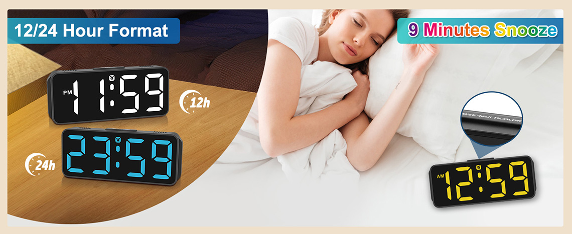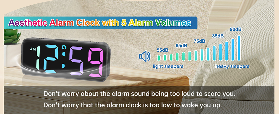 𝐋𝐨𝐮𝐝 𝐀𝐥𝐚𝐫𝐦 𝐜𝐥𝐨𝐜𝐤 𝐰𝐢𝐭𝐡 𝟓 𝐀𝐝𝐣𝐮𝐬𝐭𝐚𝐛𝐥𝐞 𝐕𝐨𝐥𝐮𝐦𝐞𝐬: Different people have different needs regarding alarm volume and snooze time. In order to wake you up naturally and gently, not suddenly, this dimmer clock has 5 alarm volumes to choose from, ranging from 55-90 dB. If you have trouble getting out of bed, the 9-minute snooze function provides the perfect wake-up cushion.