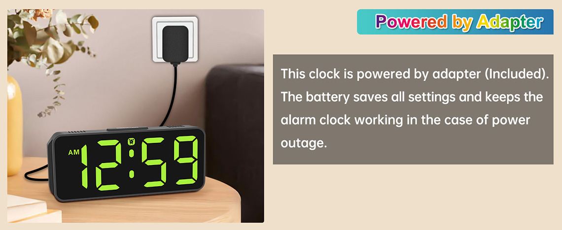 𝐏𝐥𝐮𝐠 𝐢𝐧 𝐀𝐥𝐚𝐫𝐦 𝐂𝐥𝐨𝐜𝐤 𝐰𝐢𝐭𝐡 𝐁𝐚𝐭𝐭𝐞𝐫𝐲 𝐁𝐚𝐜𝐤𝐮𝐩: This simple alarm clock designed with a battery backup function, which 4AAA batteries can keep all the setting and the alarm works well during the power outage, taking no risk of missing any important schedule. Besides, it's useful and distinctive to check the time by pressing top button, which will illuminate display for 20 seconds during power outages. 𝐈𝐦𝐩𝐨𝐫𝐭𝐚𝐧𝐭: 𝐀𝐝𝐚𝐩𝐭𝐞𝐫 (𝐢𝐧𝐜𝐥𝐮𝐝𝐞𝐝) 𝐢𝐬 𝐧𝐞𝐞𝐝𝐞𝐝 𝐭𝐨 𝐤𝐞𝐞𝐩 𝐭𝐡𝐞 𝐜𝐥𝐨𝐜𝐤 𝐰𝐨𝐫𝐤𝐢𝐧𝐠. 𝐁𝐚𝐭𝐭𝐞𝐫𝐢𝐞𝐬 𝐚𝐫𝐞 𝐟𝐨𝐫 𝐦𝐞𝐦𝐨𝐫𝐲 𝐛𝐚𝐜𝐤𝐮𝐩 𝐨𝐧𝐥𝐲.