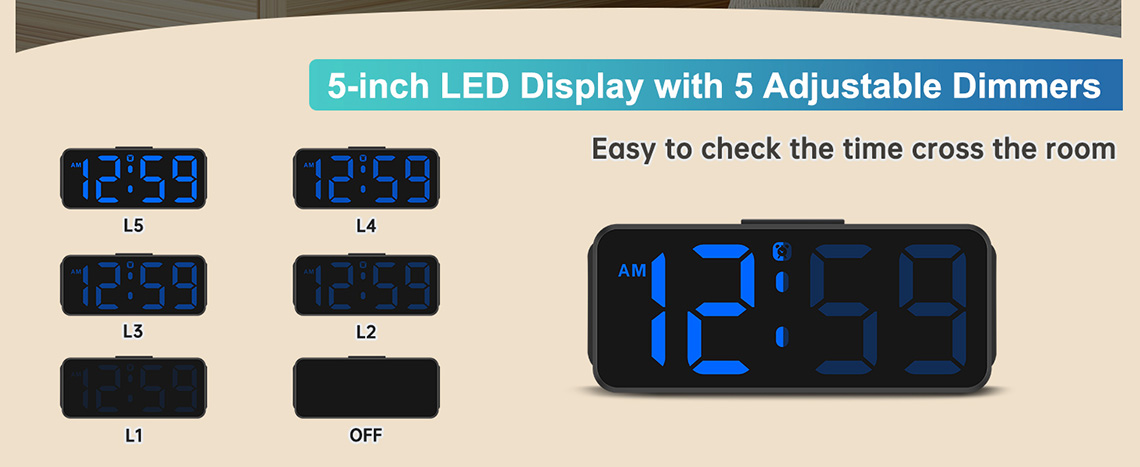 𝐃𝐢𝐦𝐦𝐚𝐛𝐥𝐞 𝐀𝐥𝐚𝐫𝐦 𝐂𝐥𝐨𝐜𝐤 𝐰𝐢𝐭𝐡 𝟔 𝐃𝐢𝐦𝐦𝐞𝐫𝐬: As a modern alarm clock for bedrooms , this brightness clock has 5 adjustable dimmer levels+OFF to satisfy different needs for brightness. The level of brightness does not distract you from sleeping, ensuring that you can clearly see the time cross the room and easily check the time at night with its large number. More importantly, this electronic clock can protect your eyesight from harm with adjustable dimmer.