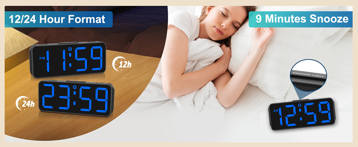 𝐋𝐨𝐮𝐝 𝐀𝐥𝐚𝐫𝐦 𝐜𝐥𝐨𝐜𝐤 𝐰𝐢𝐭𝐡 𝟓 𝐀𝐝𝐣𝐮𝐬𝐭𝐚𝐛𝐥𝐞 𝐕𝐨𝐥𝐮𝐦𝐞𝐬: Different people have different needs regarding alarm volume and snooze time. In order to wake you up naturally and gently, not suddenly, this dimmer clock has 5 alarm volumes to choose from, ranging from 55-90 dB. If you have trouble getting out of bed, the 9-minute snooze function provides the perfect wake-up cushion.