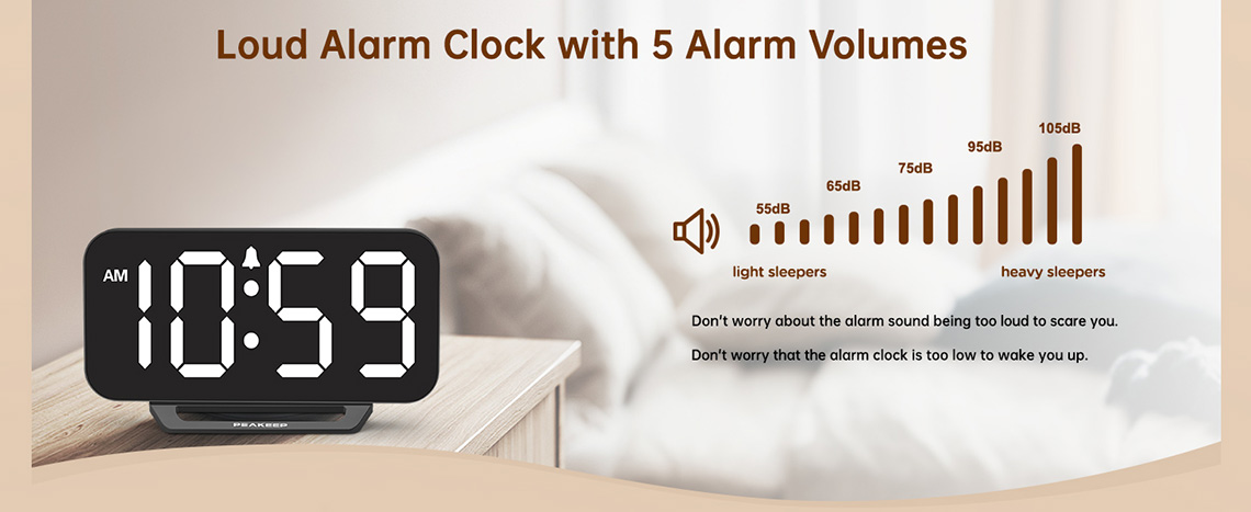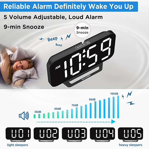 𝐋𝐨𝐮𝐝 𝐀𝐥𝐚𝐫𝐦 𝐜𝐥𝐨𝐜𝐤 𝐟𝐨𝐫 𝐡𝐞𝐚𝐯𝐲 𝐬𝐥𝐞𝐞𝐩𝐞𝐫𝐬 𝐰𝐢𝐭𝐡 𝟓 𝐀𝐝𝐣𝐮𝐬𝐭𝐚𝐛𝐥𝐞 𝐕𝐨𝐥𝐮𝐦𝐞𝐬: There’re 5 volumes from 55 to100 dB for this electric dimmer clock, no matter you’re a light sleeper or heavy sleeper, it’s a good choice. Besides, the 9-minute snooze function provides the perfect wake-up cushion if you have trouble getting out of bed.