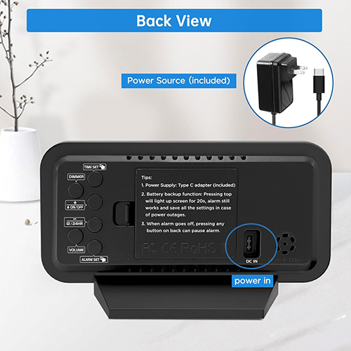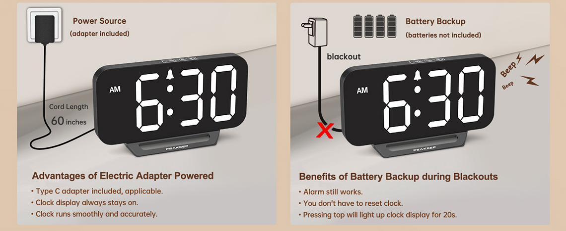 𝐄𝐥𝐞𝐜𝐭𝐫𝐢𝐜 𝐀𝐥𝐚𝐫𝐦 𝐂𝐥𝐨𝐜𝐤 𝐰𝐢𝐭𝐡 𝐁𝐚𝐭𝐭𝐞𝐫𝐲 𝐁𝐚𝐜𝐤𝐮𝐩: With a safe type C adapter (cord length 60 inches) as a power supply, this digital LED clock is able to run smoothly and accurately, an absolute must for anyone who values punctuality and reliability. 4 AAA batteries (not provided) help memorize settings and trigger the alarm in the event of power outage. This way you won’t oversleep and never need to reset clock.