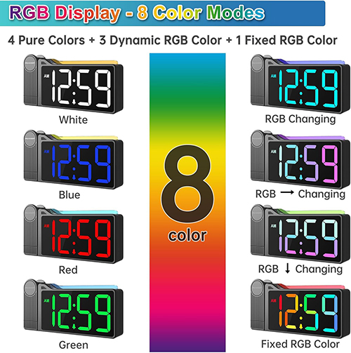 𝐑𝐆𝐁 𝐀𝐥𝐚𝐫𝐦 𝐂𝐥𝐨𝐜𝐤 𝐰𝐢𝐭𝐡 𝐂𝐨𝐥𝐨𝐫𝐟𝐮𝐥 & 𝐃𝐲𝐧𝐚𝐦𝐢𝐜 𝐋𝐚𝐫𝐠𝐞 𝐃𝐢𝐬𝐩𝐥𝐚𝐲 - Enjoy 8 different color display screens (4 Pure colors - white, blue, green and red + 3 Dynamic RGB Color and 1Fixed RGB color). This bedroom alarm clock features large, easy-to-read numbers that change color, adding a vibrant touch to your room. Enjoy a lively wake-up experience and easily see the time from any distance. Fully meets different people's color needs.