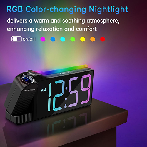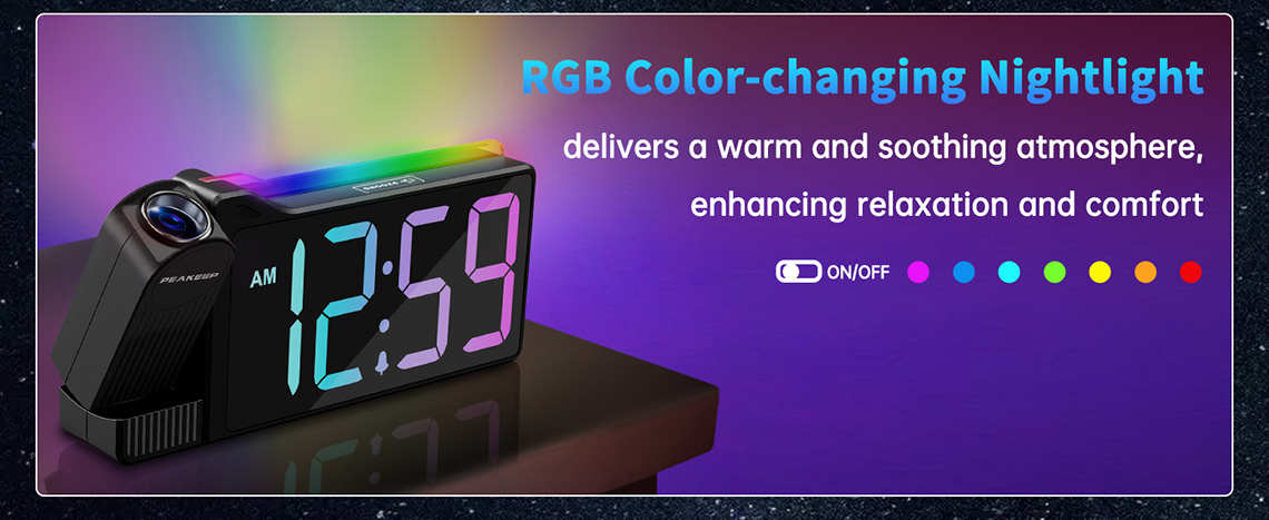 𝐃𝐢𝐠𝐢𝐭𝐚𝐥 𝐏𝐫𝐨𝐣𝐞𝐜𝐭𝐢𝐨𝐧 𝐀𝐥𝐚𝐫𝐦 𝐜𝐥𝐨𝐜𝐤 𝐰𝐢𝐭𝐡 𝐂𝐨𝐥𝐨𝐫𝐟𝐮𝐥 𝐍𝐢𝐠𝐡𝐭𝐥𝐢𝐠𝐡𝐭 - One of the key futures of this digital projection alarm clock is colorful nightlight. The 7 colors cycle through color changes to create a colored light that illuminates the room, and won't affect your sleep like turning on a headlight, especially for those who fear the dark.