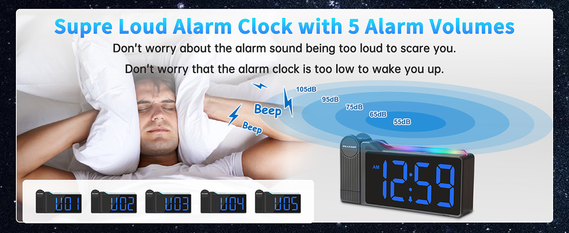 𝐋𝐨𝐮𝐝 𝐚𝐥𝐚𝐫𝐦 𝐜𝐥𝐨𝐜𝐤 𝐟𝐨𝐫 𝐡𝐞𝐚𝐯𝐲 𝐬𝐥𝐞𝐞𝐩𝐞𝐫𝐬 𝐚𝐝𝐮𝐥𝐭𝐬 - This plug-in projection bedroom clock has 5 alarm volumes to choose from and the volume range between 60-108 dB. It is a good bedroom clock for those who have trouble waking up. Also, it can protect you hearing by selecting a low alarm volume while wake you up.