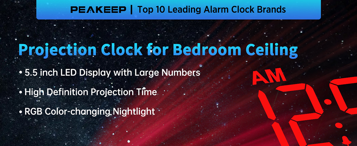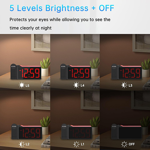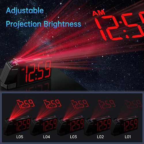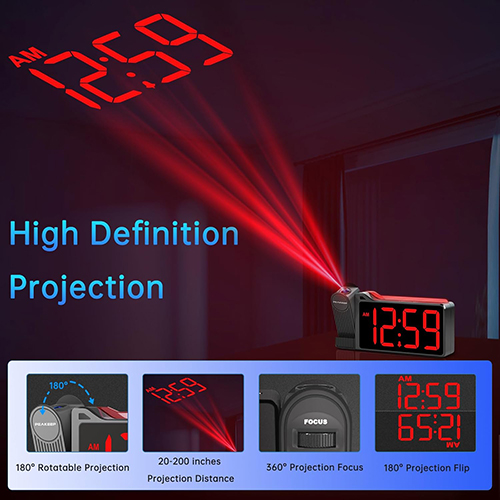 𝟏𝟖𝟎 𝐝𝐞𝐠𝐫𝐞𝐞 𝐑𝐨𝐭𝐚𝐭𝐚𝐛𝐥𝐞 𝐏𝐫𝐨𝐣𝐞𝐜𝐭𝐢𝐨𝐧 𝐀𝐥𝐚𝐫𝐦 𝐂𝐥𝐨𝐜𝐤 𝐟𝐨𝐫 𝐁𝐞𝐝𝐫𝐨𝐨𝐦 𝐂𝐞𝐢𝐥𝐢𝐧𝐠: This modern projection alarm clock rotates 180 degrees, projects distance from 20 inches to 200 inches, and has 5 projection brightness levels to choose from. Think How pleasant it would be to be in bed in the dark of the night and just look up to see the time.