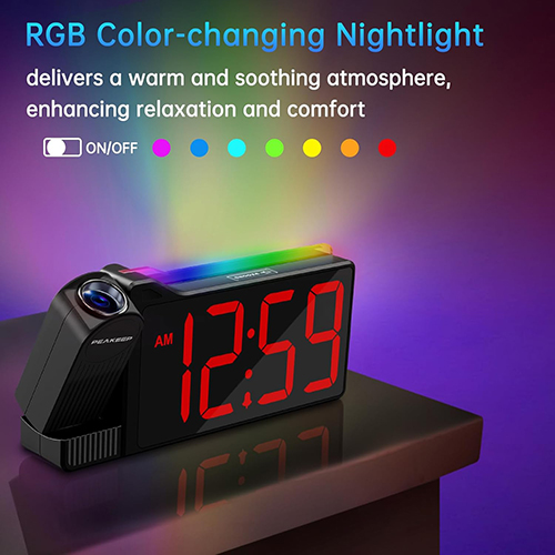 𝐃𝐢𝐠𝐢𝐭𝐚𝐥 𝐏𝐫𝐨𝐣𝐞𝐜𝐭𝐢𝐨𝐧 𝐀𝐥𝐚𝐫𝐦 𝐜𝐥𝐨𝐜𝐤 𝐰𝐢𝐭𝐡 𝐂𝐨𝐥𝐨𝐫𝐟𝐮𝐥 𝐍𝐢𝐠𝐡𝐭𝐥𝐢𝐠𝐡𝐭: An RGB color-changing nightlight delivers a warm and soothing atmosphere, enhancing relaxation and comfort. It can also function as a guiding light in the dark, reducing the risk of trips and falls. Moreover, its soft glow can aid in better sleep by providing just enough light without disturbing the sleep cycle.