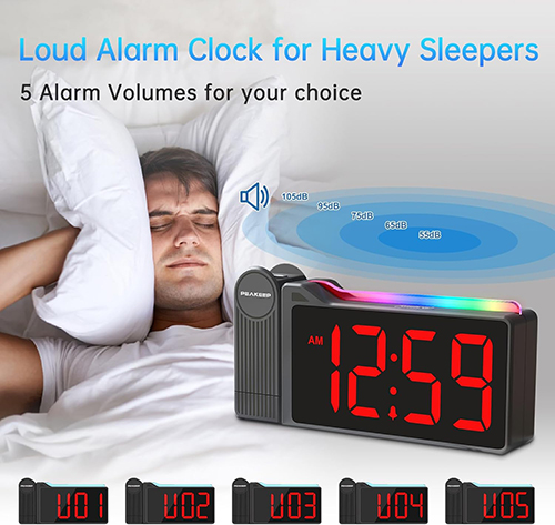 𝐋𝐨𝐮𝐝 𝐚𝐥𝐚𝐫𝐦 𝐜𝐥𝐨𝐜𝐤 𝐟𝐨𝐫 𝐡𝐞𝐚𝐯𝐲 𝐬𝐥𝐞𝐞𝐩𝐞𝐫𝐬 𝐚𝐝𝐮𝐥𝐭𝐬: This plug-in projection bedroom clock has 5 alarm volumes to choose from and the volume range between 60-108 dB. It is a good bedroom clock for those who have trouble waking up. Also, it can protect you hearing by selecting a low alarm volume while wake you up.