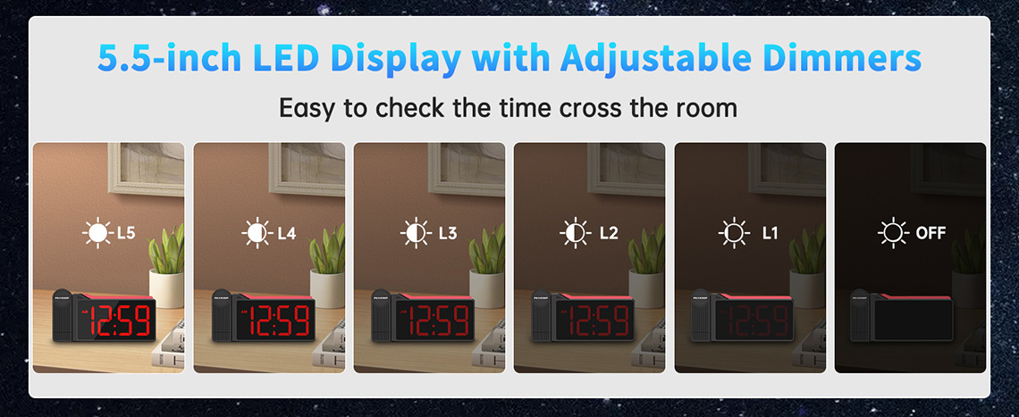 𝐋𝐚𝐫𝐠𝐞 𝐃𝐢𝐬𝐩𝐥𝐚𝐲 𝐃𝐢𝐠𝐢𝐭𝐚𝐥 𝐂𝐥𝐨𝐜𝐤 𝐰𝐢𝐭𝐡 𝐁𝐢𝐠 𝐍𝐮𝐦𝐛𝐞𝐫: 5.5 inch display & 2.1inch reading number & 6 levels of adjustable brightness, fully meet the needs of different age groups for alarm clock functions, Especially for the elderly, senior. With its adjustable brightness, this LED projection clock not only ensures that you can see the time at night from a distance, but also protects your eyesight from harm.