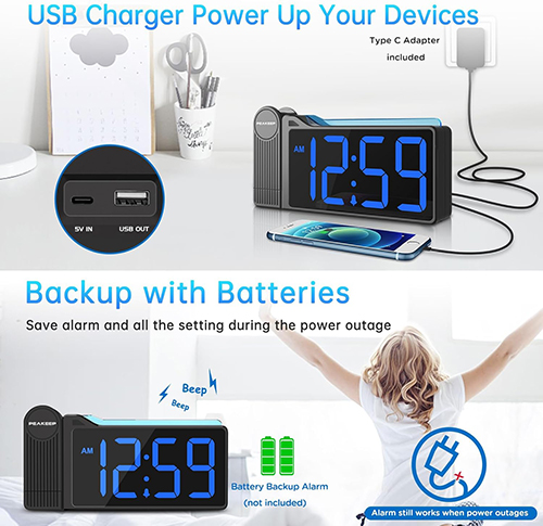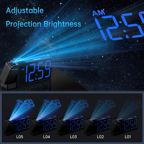 𝟏𝟖𝟎 𝐝𝐞𝐠𝐫𝐞𝐞 𝐑𝐨𝐭𝐚𝐭𝐚𝐛𝐥𝐞 𝐏𝐫𝐨𝐣𝐞𝐜𝐭𝐢𝐨𝐧 𝐀𝐥𝐚𝐫𝐦 𝐂𝐥𝐨𝐜𝐤 𝐟𝐨𝐫 𝐁𝐞𝐝𝐫𝐨𝐨𝐦 𝐂𝐞𝐢𝐥𝐢𝐧𝐠: This modern projection alarm clock rotates 180 degrees, projects distance from 20 inches to 200 inches, and has 5 projection brightness levels to choose from. Think How pleasant it would be to be in bed in the dark of the night and just look up to see the time.