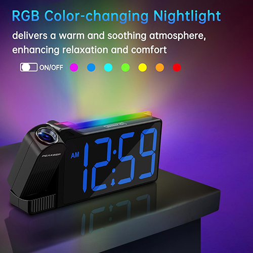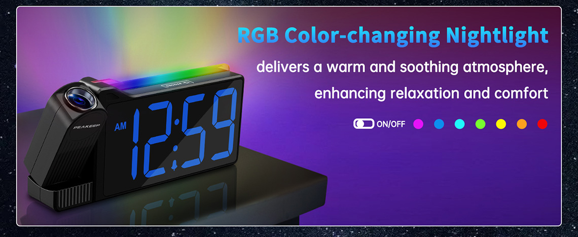 𝐃𝐢𝐠𝐢𝐭𝐚𝐥 𝐏𝐫𝐨𝐣𝐞𝐜𝐭𝐢𝐨𝐧 𝐀𝐥𝐚𝐫𝐦 𝐜𝐥𝐨𝐜𝐤 𝐰𝐢𝐭𝐡 𝐂𝐨𝐥𝐨𝐫𝐟𝐮𝐥 𝐍𝐢𝐠𝐡𝐭𝐥𝐢𝐠𝐡𝐭: An RGB color-changing nightlight delivers a warm and soothing atmosphere, enhancing relaxation and comfort. It can also function as a guiding light in the dark, reducing the risk of trips and falls. Moreover, its soft glow can aid in better sleep by providing just enough light without disturbing the sleep cycle.