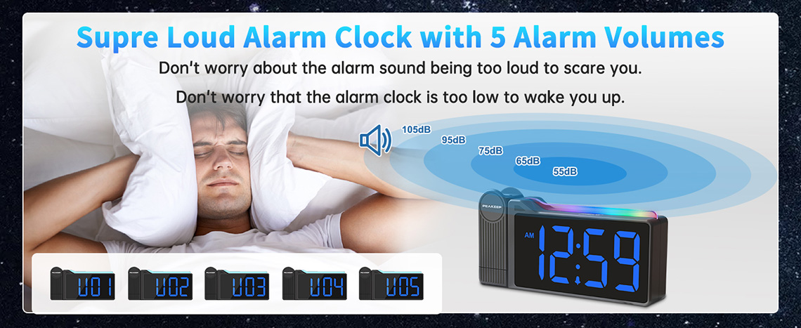 𝐋𝐨𝐮𝐝 𝐚𝐥𝐚𝐫𝐦 𝐜𝐥𝐨𝐜𝐤 𝐟𝐨𝐫 𝐡𝐞𝐚𝐯𝐲 𝐬𝐥𝐞𝐞𝐩𝐞𝐫𝐬 𝐚𝐝𝐮𝐥𝐭𝐬: This plug-in projection bedroom clock has 5 alarm volumes to choose from and the volume range between 60-108 dB. It is a good bedroom clock for those who have trouble waking up. Also, it can protect you hearing by selecting a low alarm volume while wake you up.