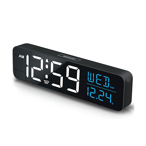 Peakeep Large Display Digital Alarm Clock for Bedrooms, Date Day of Week Calendar Desk Table Clocks for Living Room Office, Dimmable Plug in Electric Clock, 5 Volumes, Loud, Auto DST