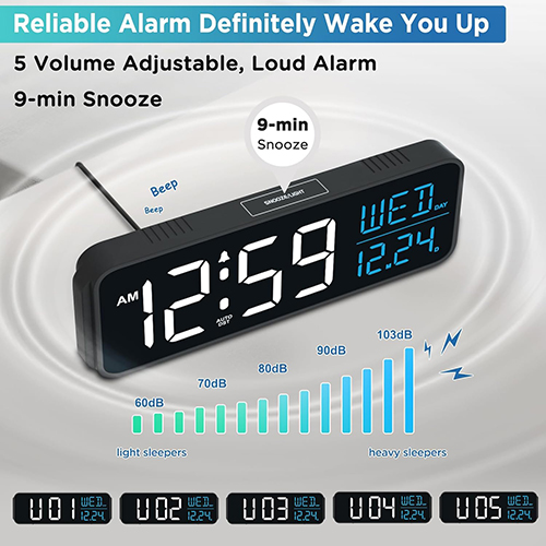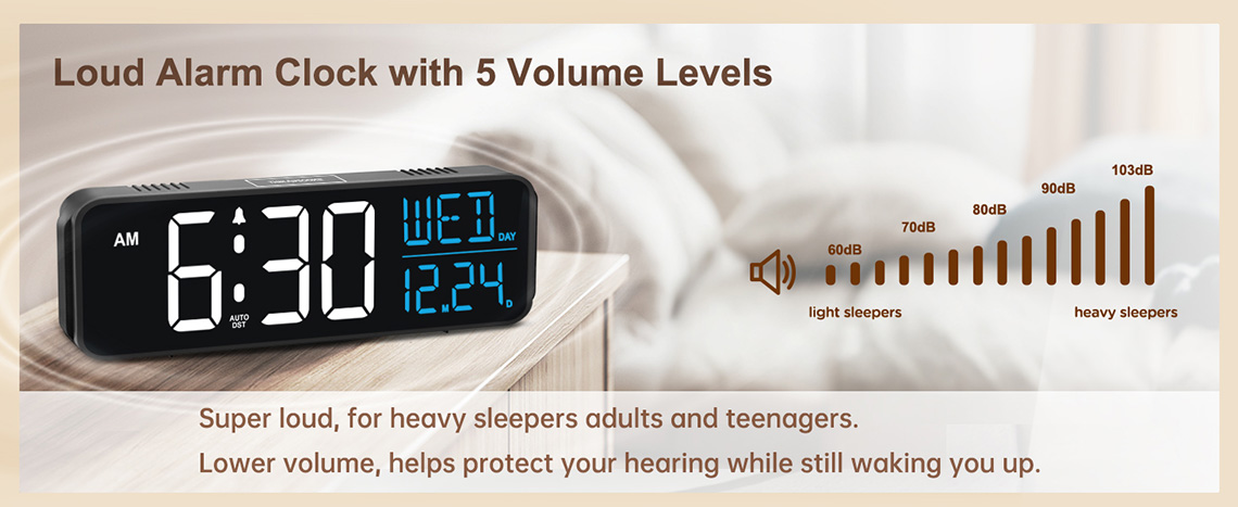 𝐋𝐨𝐮𝐝 𝐀𝐥𝐚𝐫𝐦 𝐂𝐥𝐨𝐜𝐤 𝐟𝐨𝐫 𝐇𝐞𝐚𝐯𝐲 𝐒𝐥𝐞𝐞𝐩𝐞𝐫𝐬: 5 settings of volume control for the alarm enable the clock to be super loud for heavy sleepers or those who have trouble waking up. It also allows you to set the alarm to a lower volume to help protect your hearing while still waking you up. 9-min snooze can be helpful if you like to catch a few extra minutes of sleep in the morning.