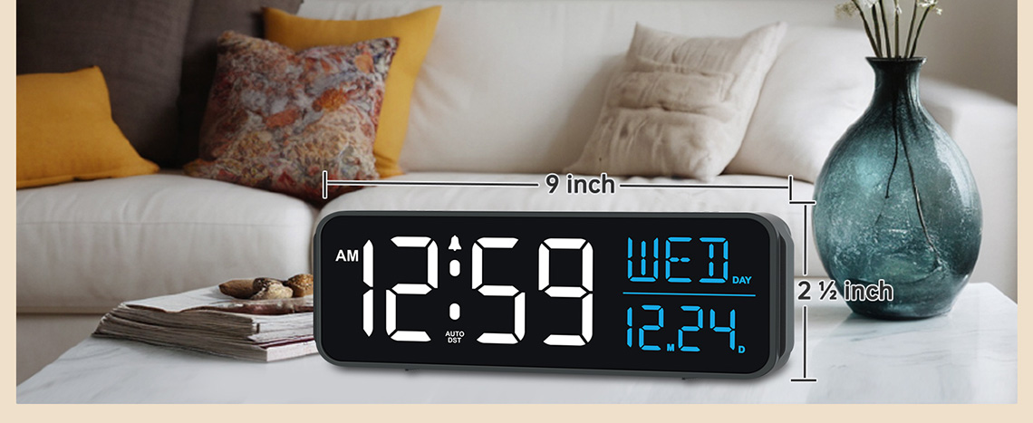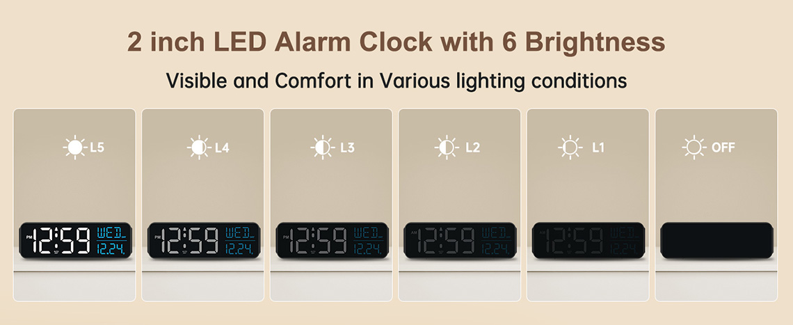 𝐋𝐚𝐫𝐠𝐞 𝐍𝐮𝐦𝐛𝐞𝐫𝐬 𝐰𝐢𝐭𝐡 𝐀𝐝𝐣𝐮𝐬𝐭𝐚𝐛𝐥𝐞 𝐁𝐫𝐢𝐠𝐡𝐭𝐧𝐞𝐬𝐬: 2-inch height of large numbers are friendly for seniors / elderly and people with poor eyesight. 5 different brightness settings ensure clock time is always visible in various lighting conditions: brighter and comfort in day or lower brightness at night for an improved sleep or completely off at night.