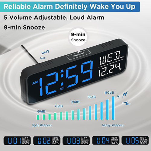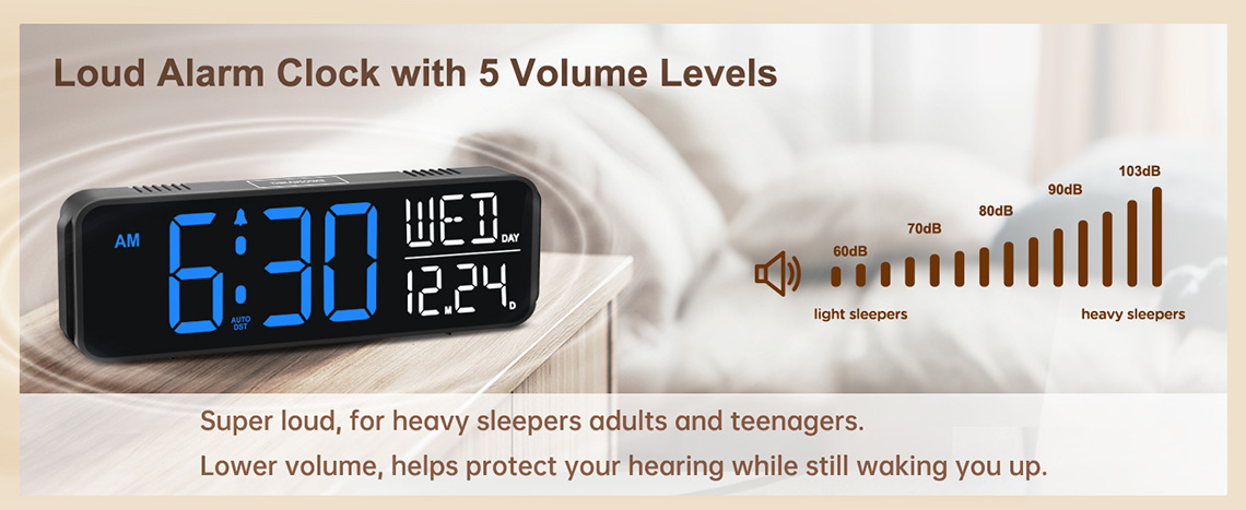 𝐋𝐨𝐮𝐝 𝐀𝐥𝐚𝐫𝐦 𝐂𝐥𝐨𝐜𝐤 𝐟𝐨𝐫 𝐇𝐞𝐚𝐯𝐲 𝐒𝐥𝐞𝐞𝐩𝐞𝐫𝐬: 5 settings of volume control for the alarm enable the clock to be super loud for heavy sleepers or those who have trouble waking up. It also allows you to set the alarm to a lower volume to help protect your hearing while still waking you up. 9-min snooze can be helpful if you like to catch a few extra minutes of sleep in the morning.