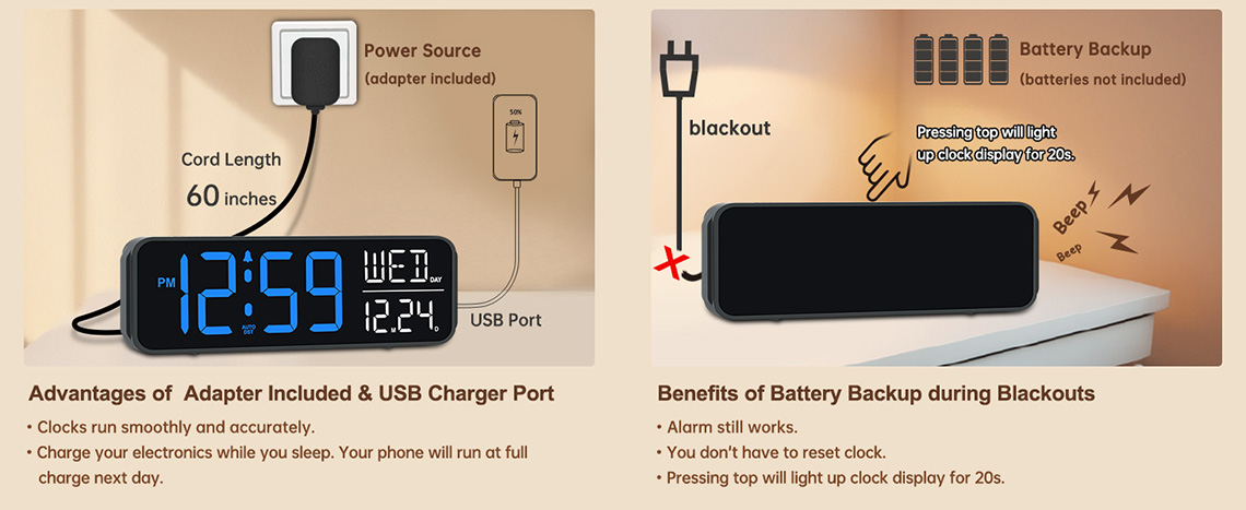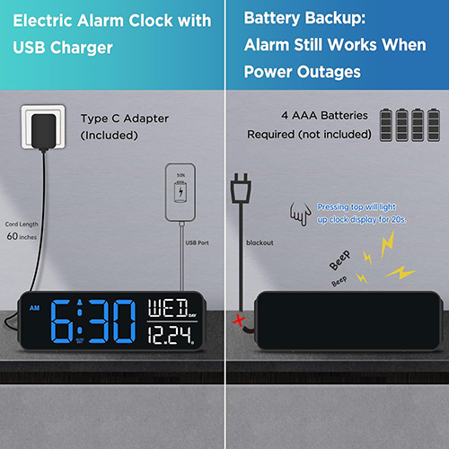 𝐄𝐥𝐞𝐜𝐭𝐫𝐢𝐜 𝐀𝐥𝐚𝐫𝐦 𝐂𝐥𝐨𝐜𝐤 𝐰𝐢𝐭𝐡 𝐁𝐚𝐭𝐭𝐞𝐫𝐲 𝐁𝐚𝐜𝐤𝐮𝐩: With an applicable type C adapter (included), this digital LED clock is able to run smoothly and accurately. 4 AAA batteries (not provided) can backup and memorize clock settings and trigger the alarm, this way you won’t oversleep or worry about resetting the time when power outages.