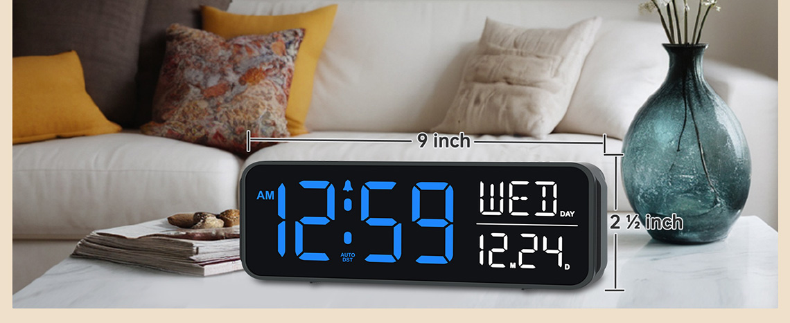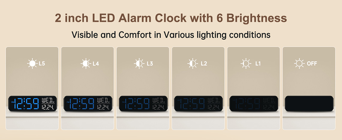 𝐋𝐚𝐫𝐠𝐞 𝐍𝐮𝐦𝐛𝐞𝐫𝐬 𝐰𝐢𝐭𝐡 𝐀𝐝𝐣𝐮𝐬𝐭𝐚𝐛𝐥𝐞 𝐁𝐫𝐢𝐠𝐡𝐭𝐧𝐞𝐬𝐬: 2-inch height of large numbers are friendly for seniors / elderly and people with poor eyesight. 5 different brightness settings ensure clock time is always visible in various lighting conditions: brighter and comfort in day or lower brightness at night for an improved sleep or completely off at night.