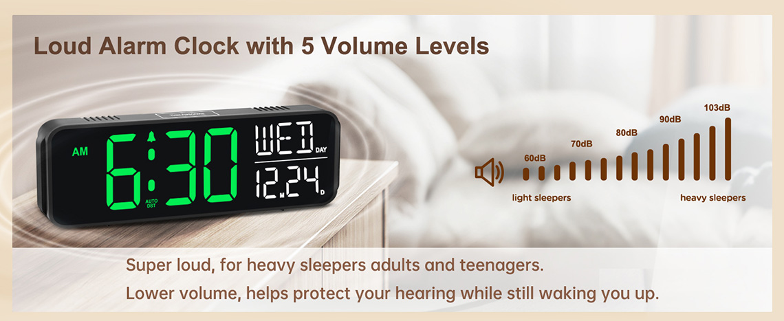 𝐋𝐨𝐮𝐝 𝐀𝐥𝐚𝐫𝐦 𝐂𝐥𝐨𝐜𝐤 𝐟𝐨𝐫 𝐇𝐞𝐚𝐯𝐲 𝐒𝐥𝐞𝐞𝐩𝐞𝐫𝐬: 5 settings of volume control for the alarm enable the clock to be super loud for heavy sleepers or those who have trouble waking up. It also allows you to set the alarm to a lower volume to help protect your hearing while still waking you up. 9-min snooze can be helpful if you like to catch a few extra minutes of sleep in the morning.