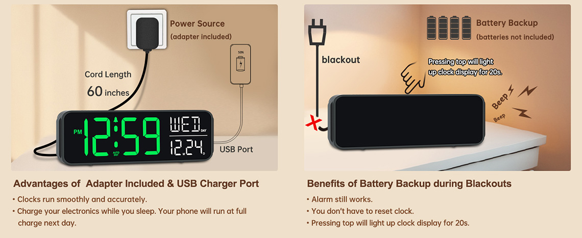 𝐄𝐥𝐞𝐜𝐭𝐫𝐢𝐜 𝐀𝐥𝐚𝐫𝐦 𝐂𝐥𝐨𝐜𝐤 𝐰𝐢𝐭𝐡 𝐁𝐚𝐭𝐭𝐞𝐫𝐲 𝐁𝐚𝐜𝐤𝐮𝐩: With an applicable type C adapter (included), this digital LED clock is able to run smoothly and accurately. 4 AAA batteries (not provided) can backup and memorize clock settings and trigger the alarm, this way you won’t oversleep or worry about resetting the time when power outages.