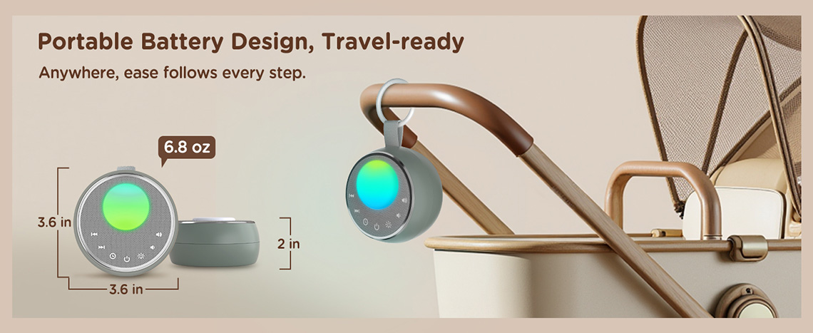 𝐏𝐨𝐫𝐭𝐚𝐛𝐥𝐞 𝐓𝐫𝐚𝐯𝐞𝐥 𝐒𝐨𝐮𝐧𝐝 𝐌𝐚𝐜𝐡𝐢𝐧𝐞: Equipped with a handy carabiner, Peakeep ingenious sound machine effortlessly attaches to any bag, stroller, or luggage. Its compact size makes it a perfect fit for diaper bags, briefcases, or even your carry-on luggage. Whether you’re on a long-haul flight, seeking serenity in a hotel room, or aiming to create an instant calm in your office cubicle, this little marvel is always ready to travel with you.